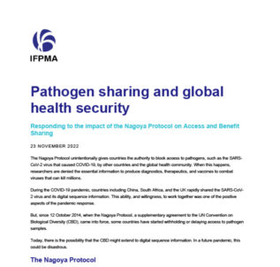 IFPMA’s vision IFPMA is actively representing the innovative pharmaceutical industry in policy discussions with governments and international health bodies to help ensure pathogens and their information are shared more widely and speedily. We ask Member States and relevant multilateral partners to help facilitate the fast and unencumbered sharing of pathogens and their data to help deliver on the 100-Day Mission and deliver its full benefits for the sake of global public health.