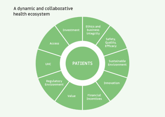 We do this through an ecosystem approach that features innovation, access, health systems strengthening, regulatory harmonization and the fight against falsified medicines, UHC, investment and trade, encompassed by business integrity.